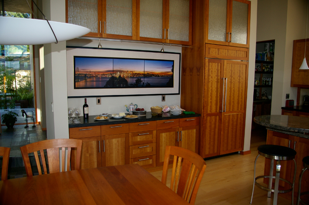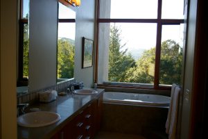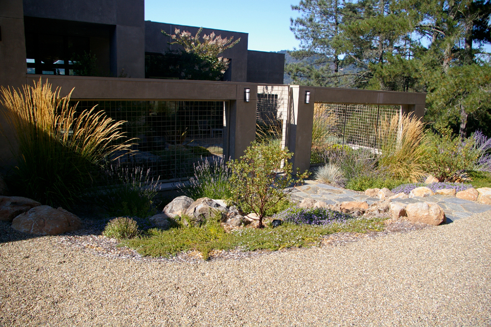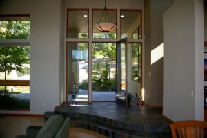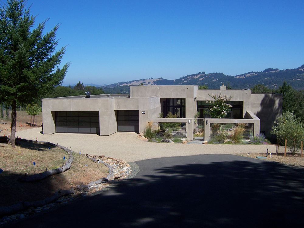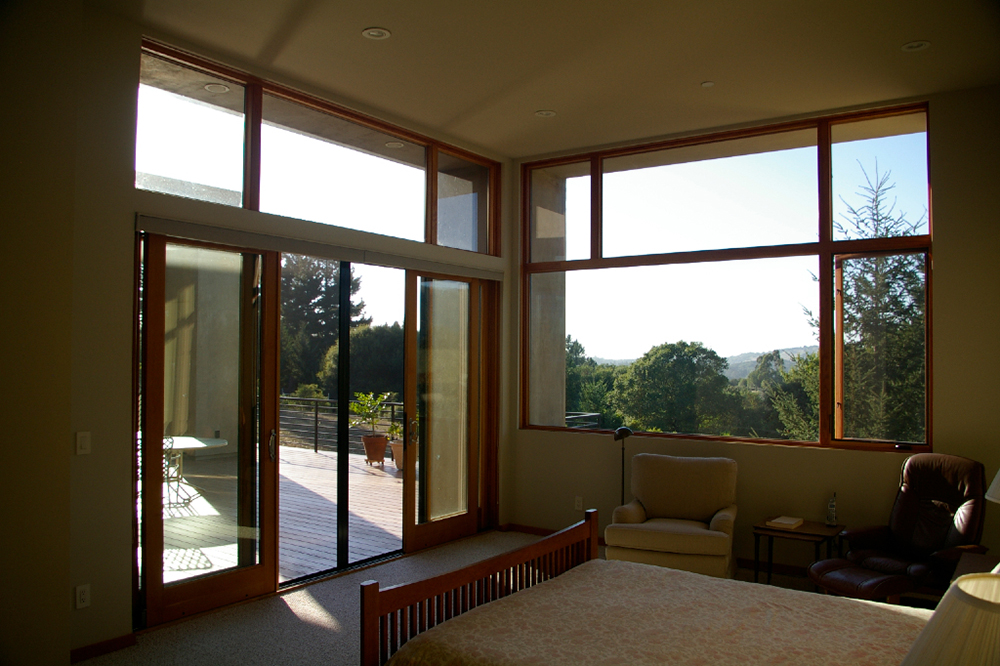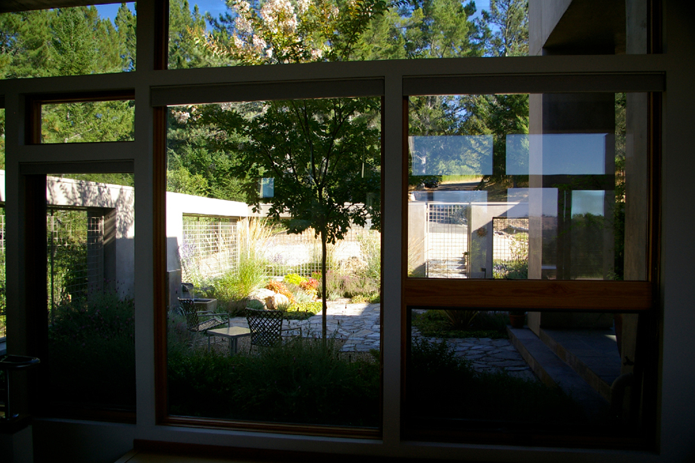 The modern architecture of this house blends well into the Sonoma County landscape. Large clearstory Andersen-Eagle windows throughout the house provide garden views for a feeling of outdoor living. The courtyard living wall allows for a view and provides plant protection from the wildlife.