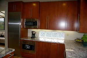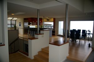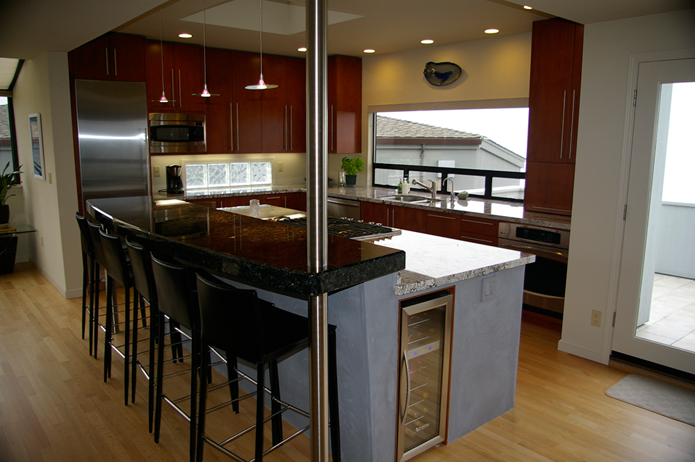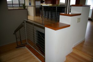 A completely new kitchen with all new appliances and materials also included refrigerator relocation. Full walls were removed and half stepped walls were incorporated into a completely redone oak staircase with stainless steel posts and handrails.